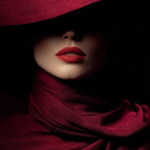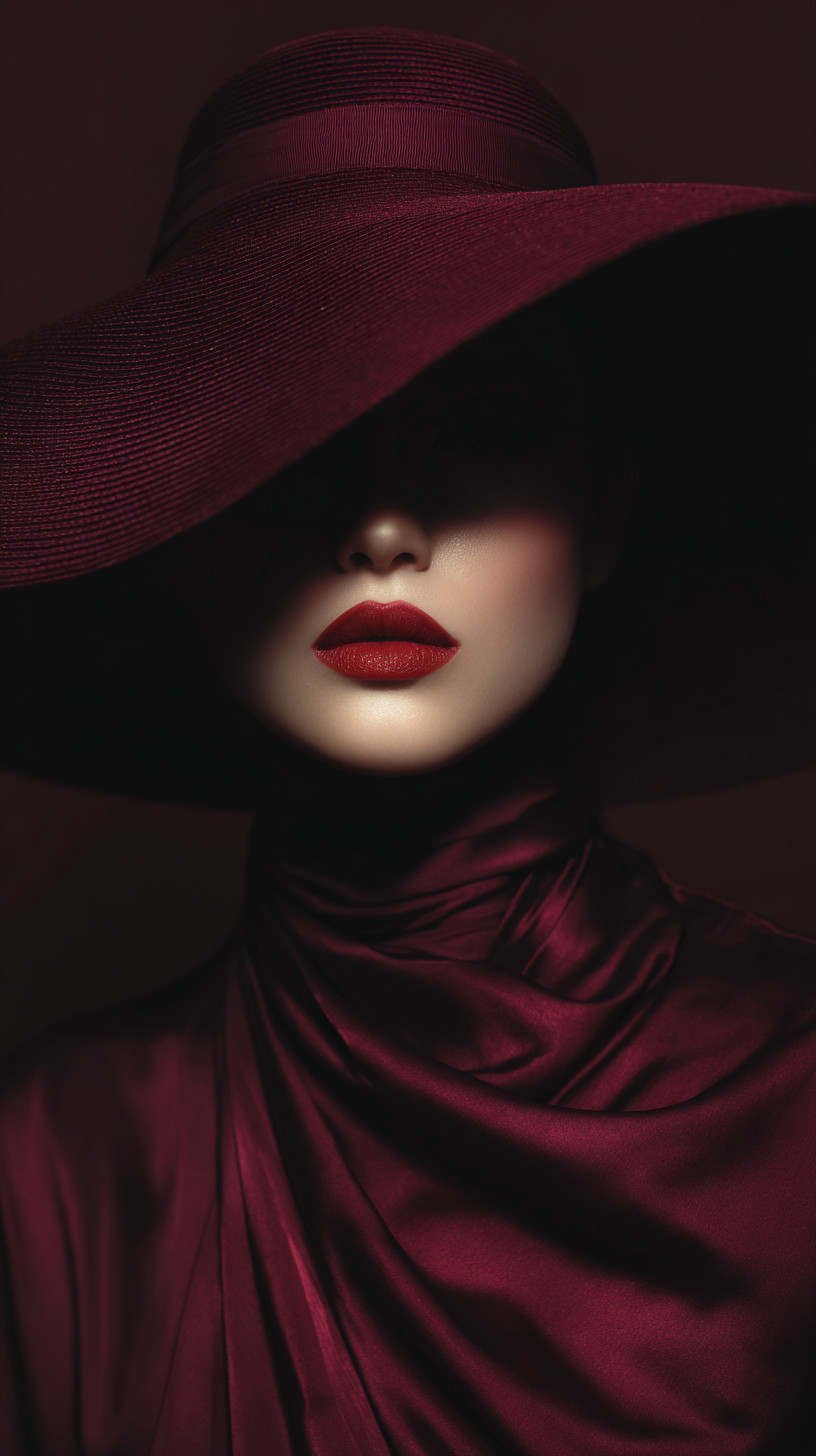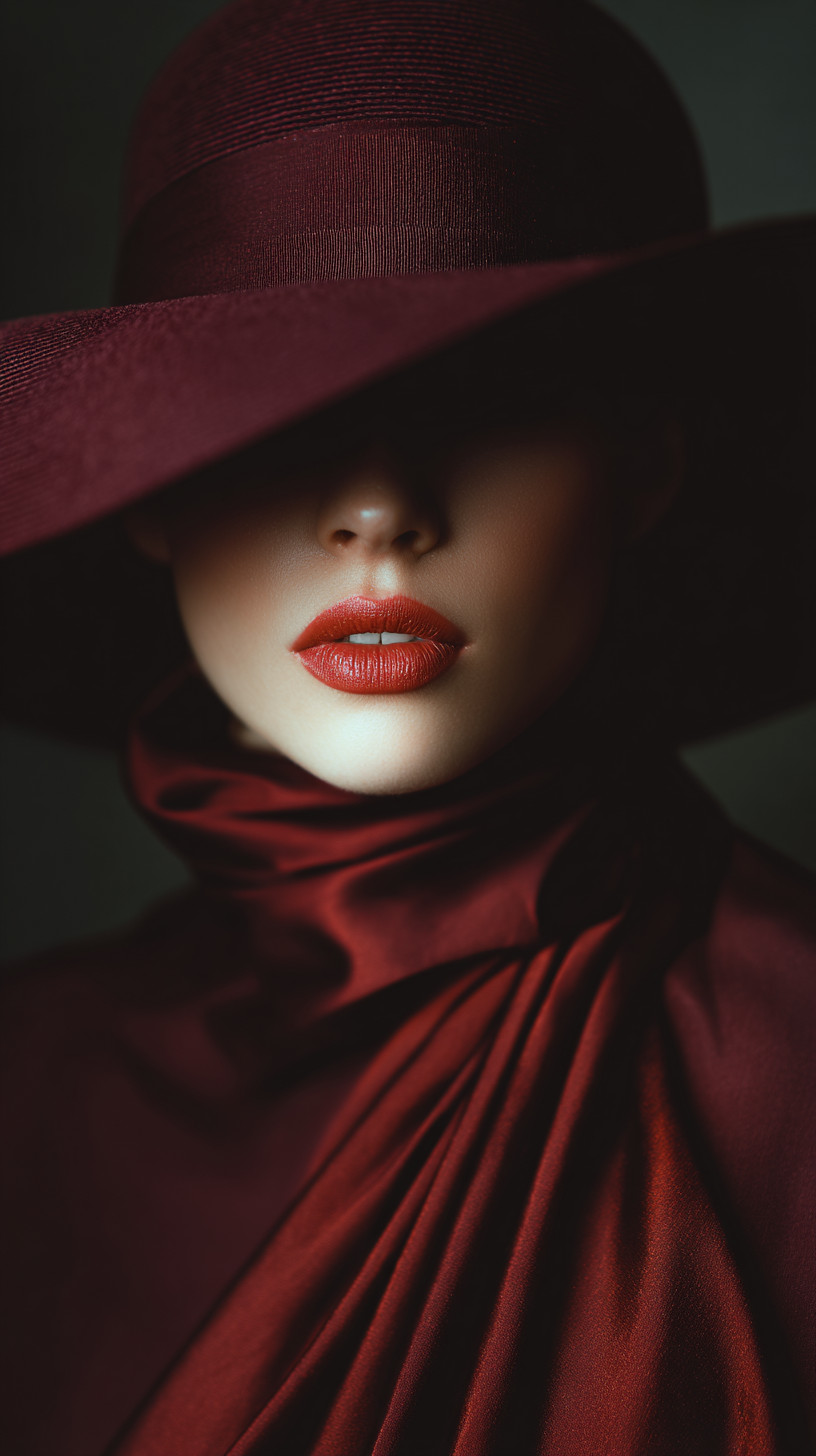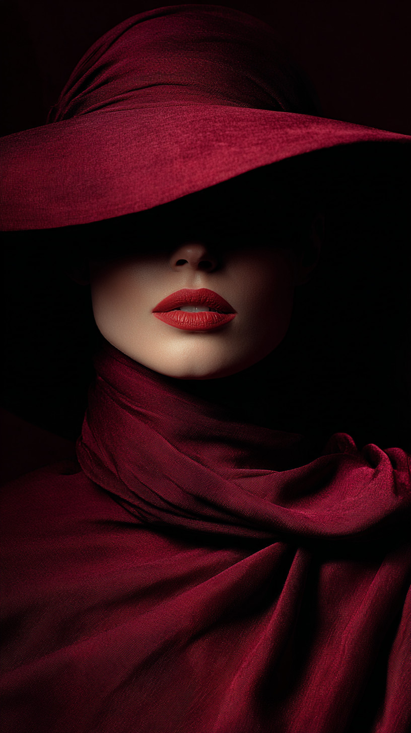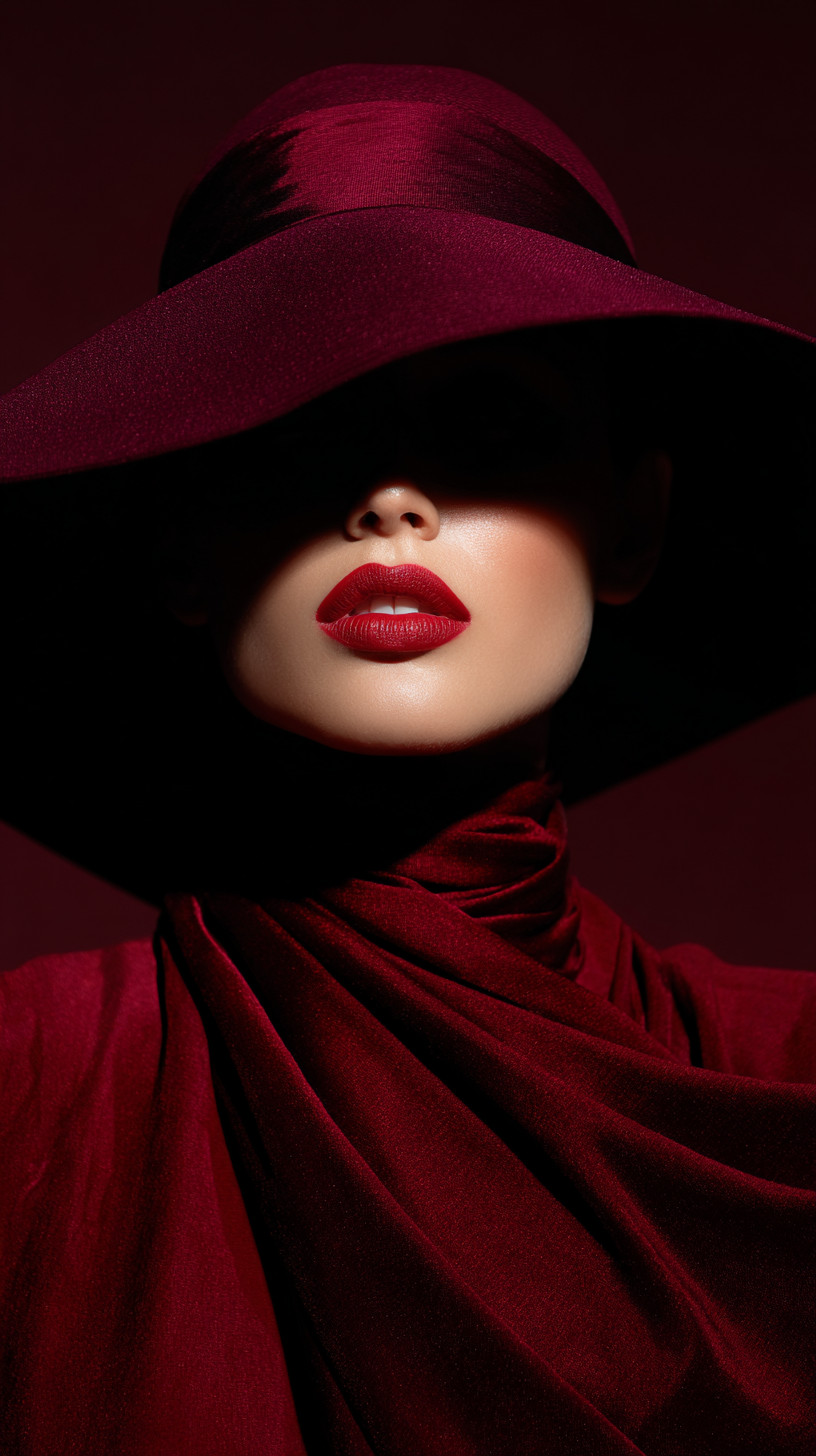 Портрет элегантной женщины в широкополой бордовой шляпе, укутанной в насыщенный красный шёлк.