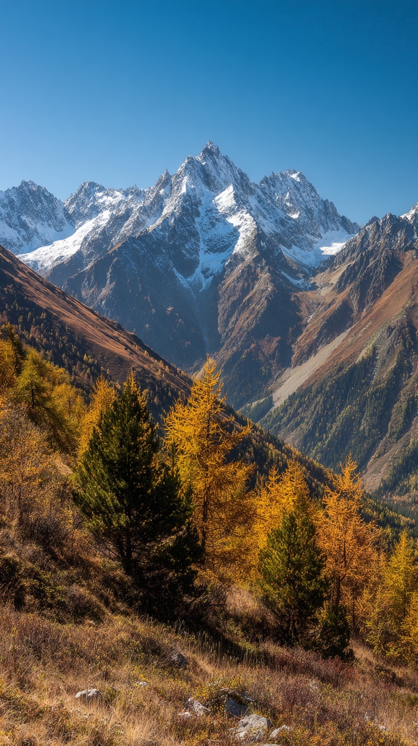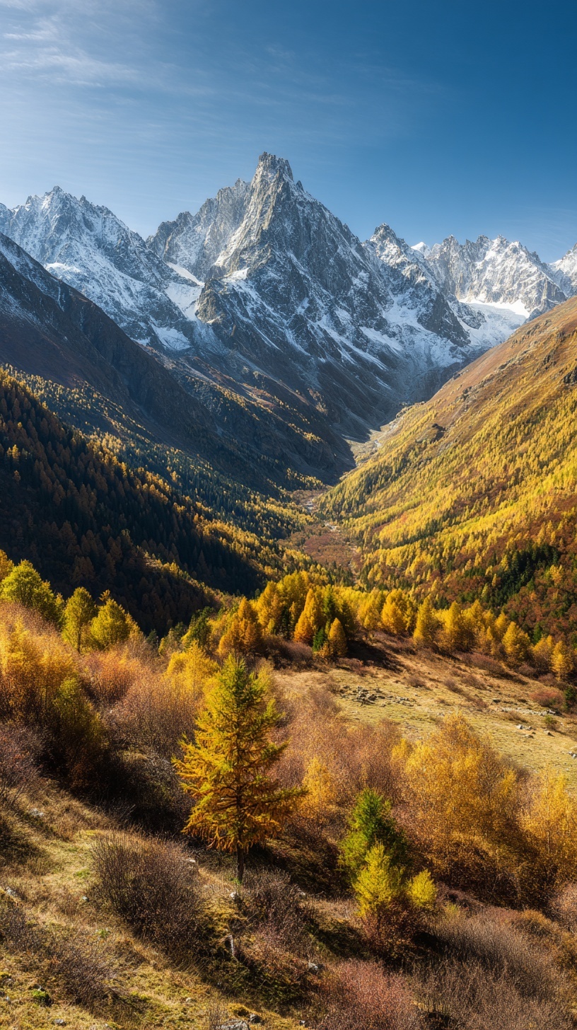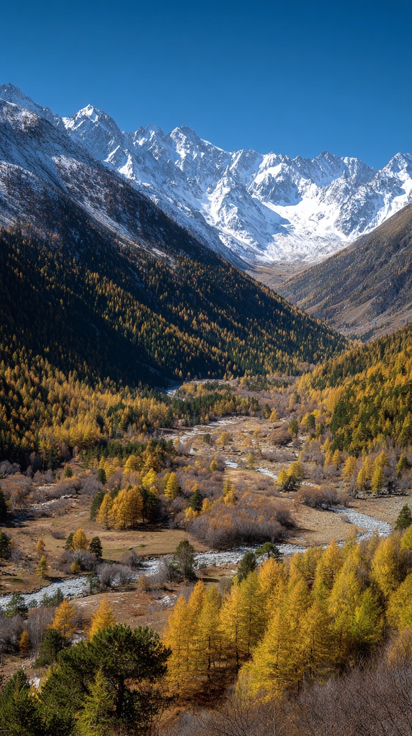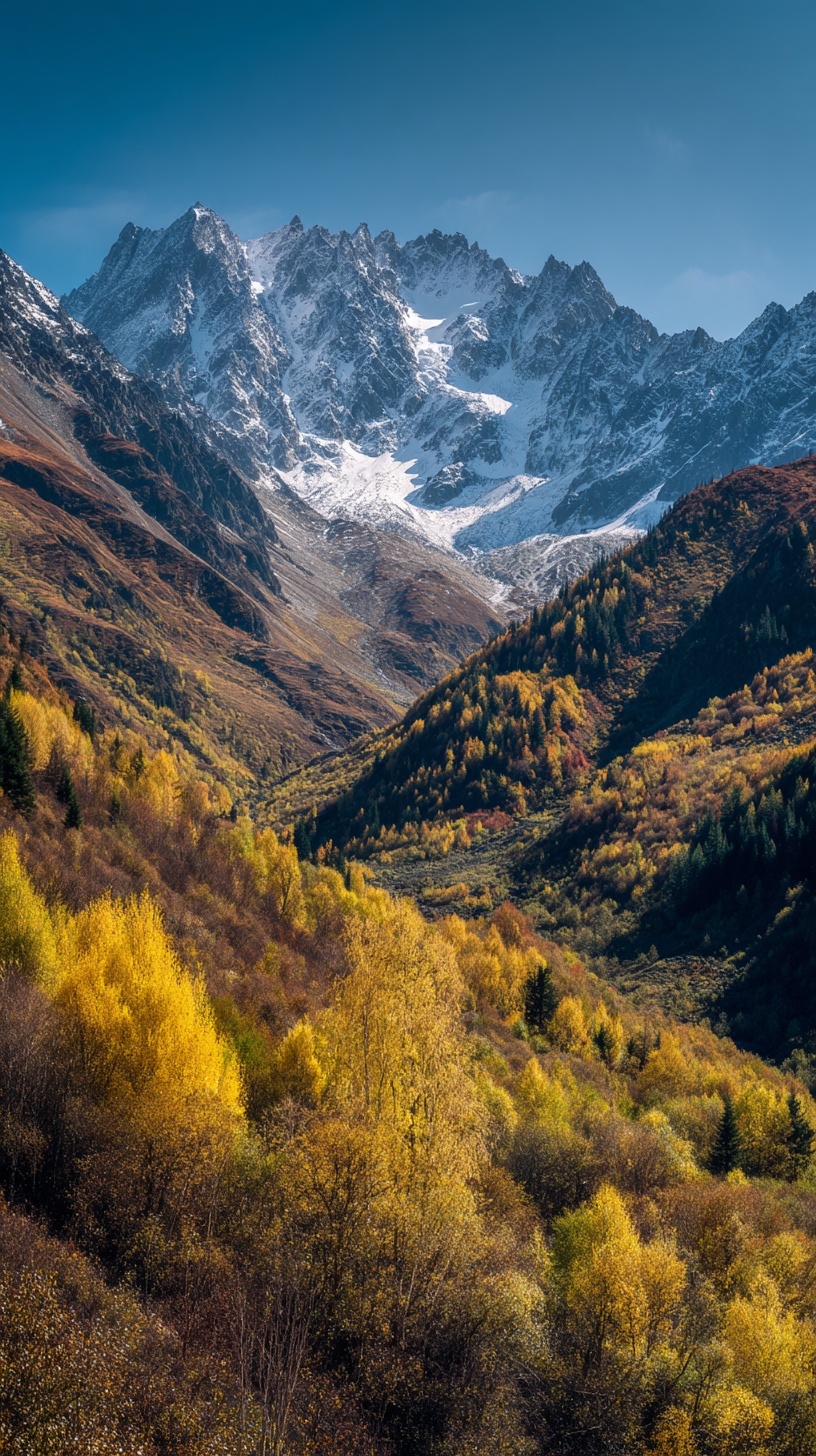 Вид долины Домбай осенью. Золотые лиственницы, заснеженные пики Кавказа