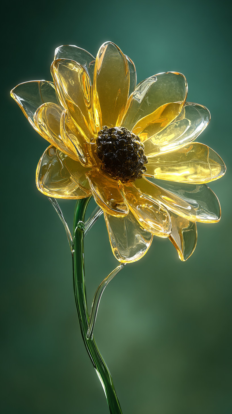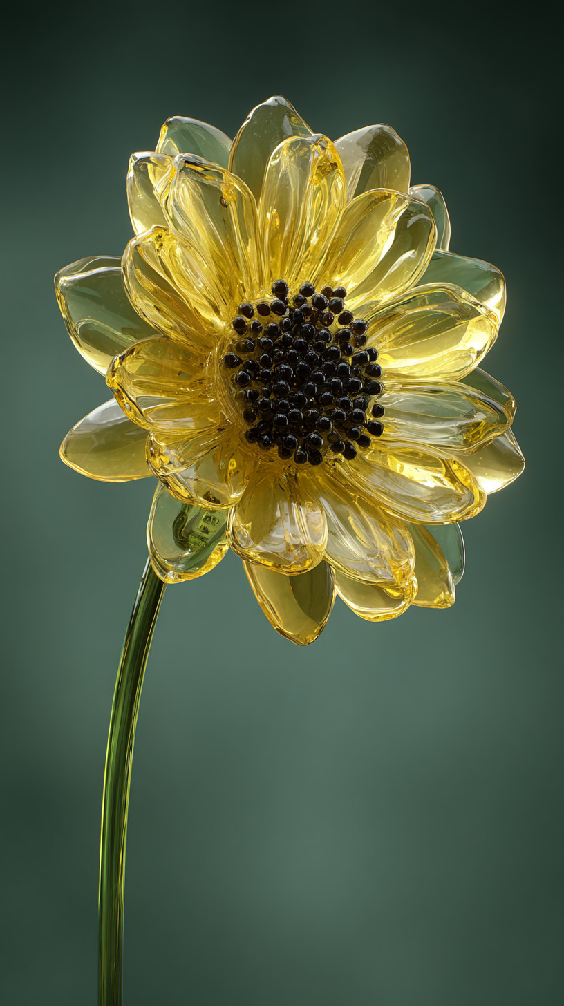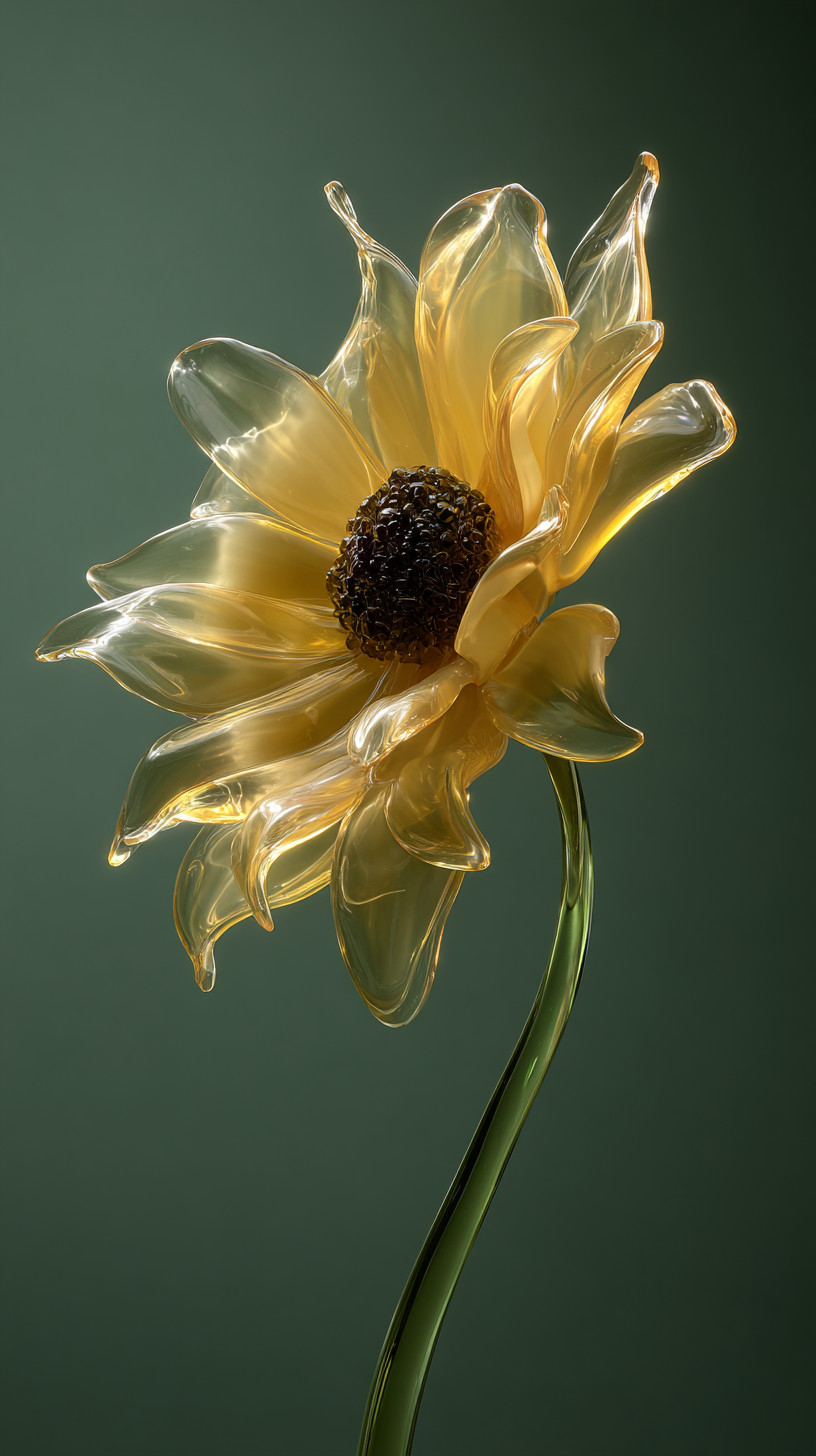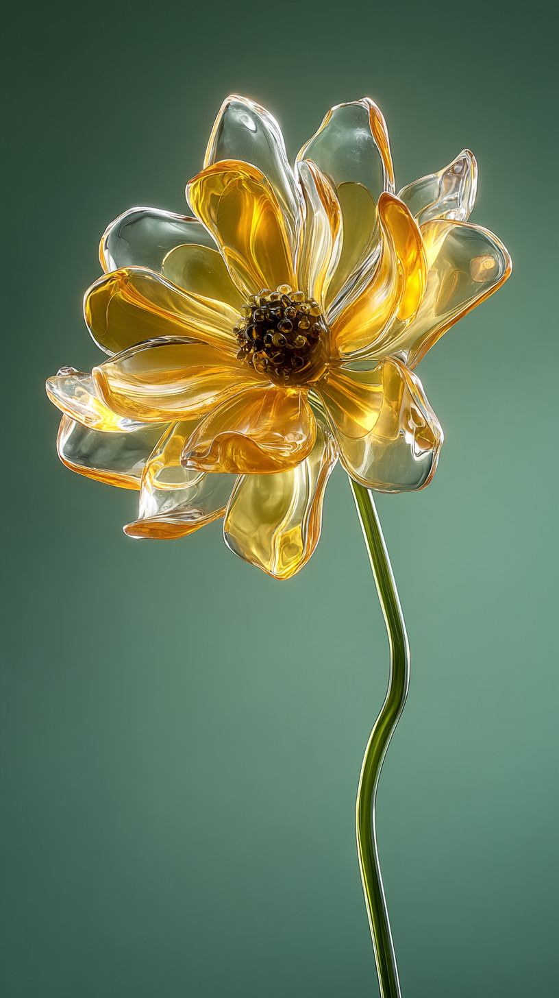 Нежный желтый цветок, полностью выполненный из прозрачного стекла с мягким золотистым оттенком.