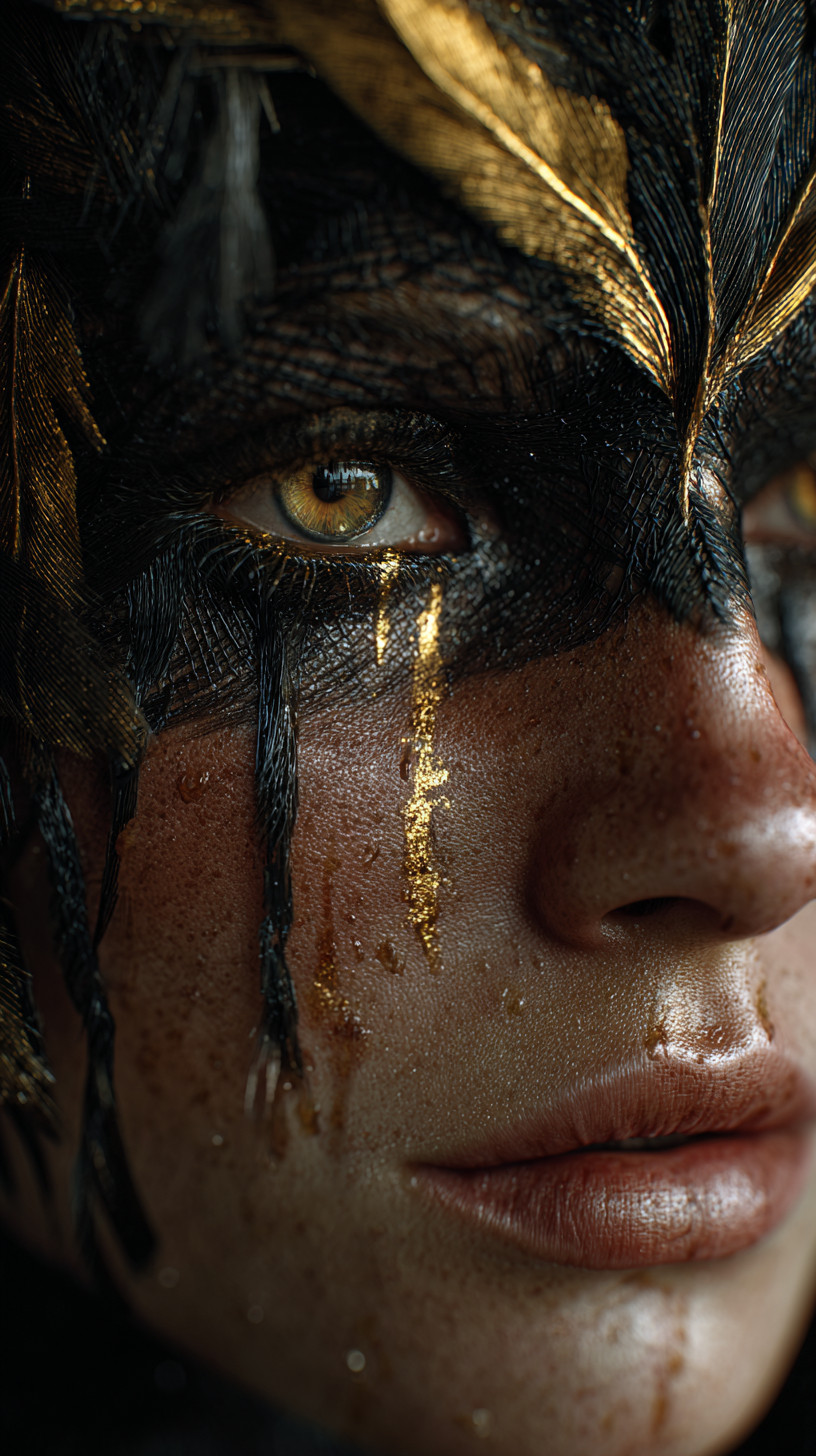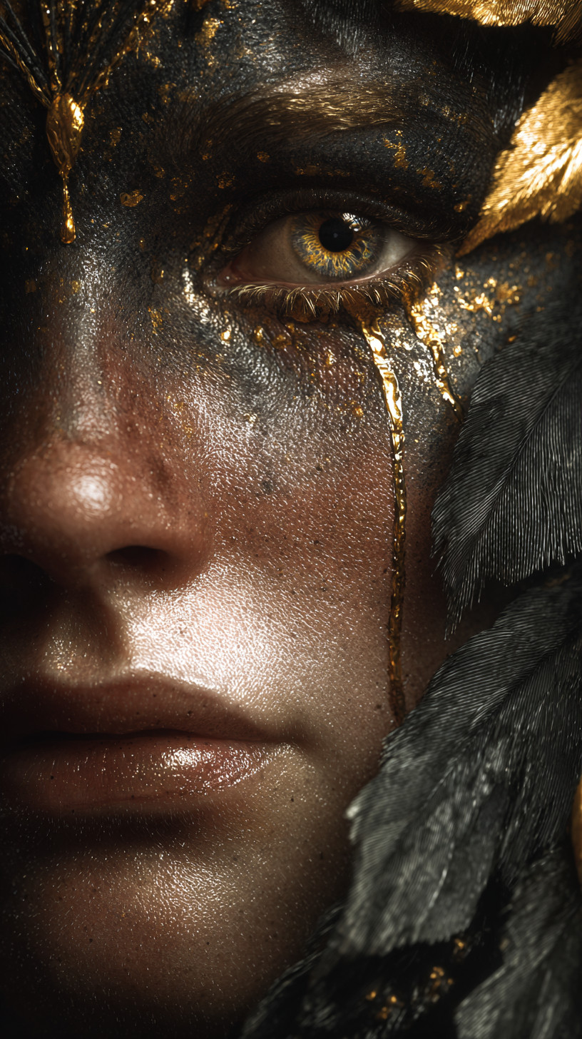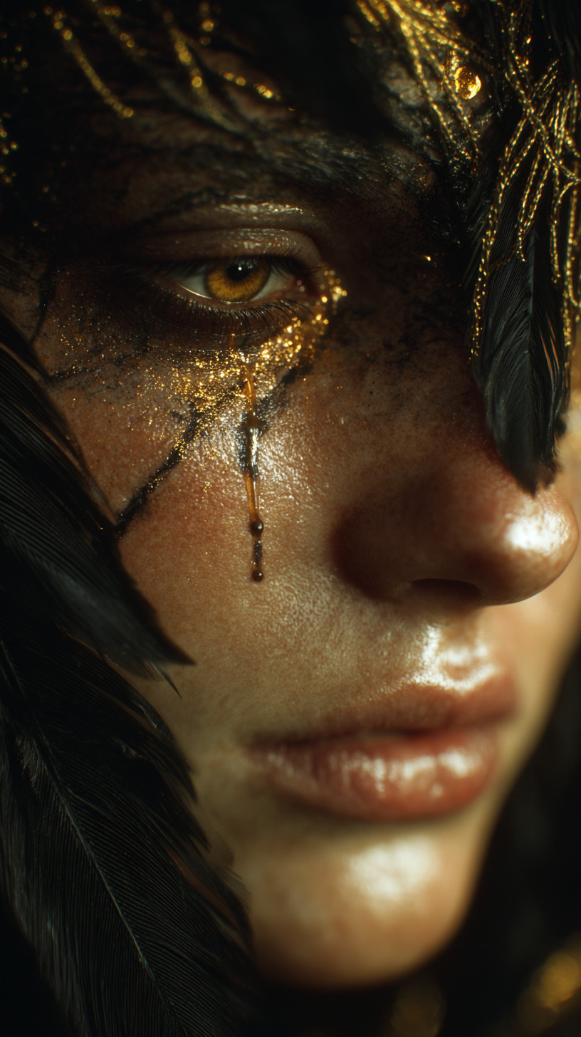 Спокойное выражение, ритуальная атмосфера, мягкий мерцающий золотой свет и детализированная кожа.