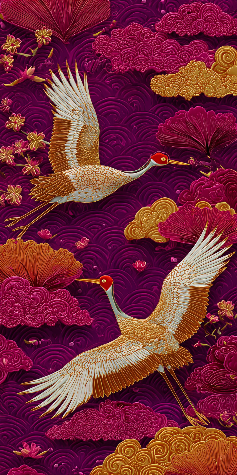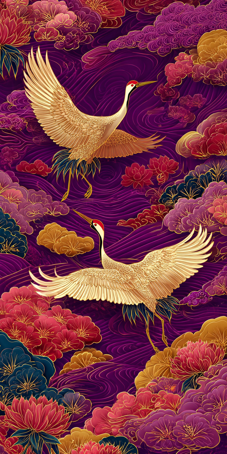 Золотые журавли на пурпурном фоне