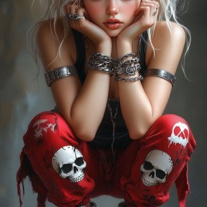 Девушка сидит на корточках, подперев лицо руками. Платиновые кудрявые хвостики, красно-серая бандана, бледная кожа, яркий макияж.