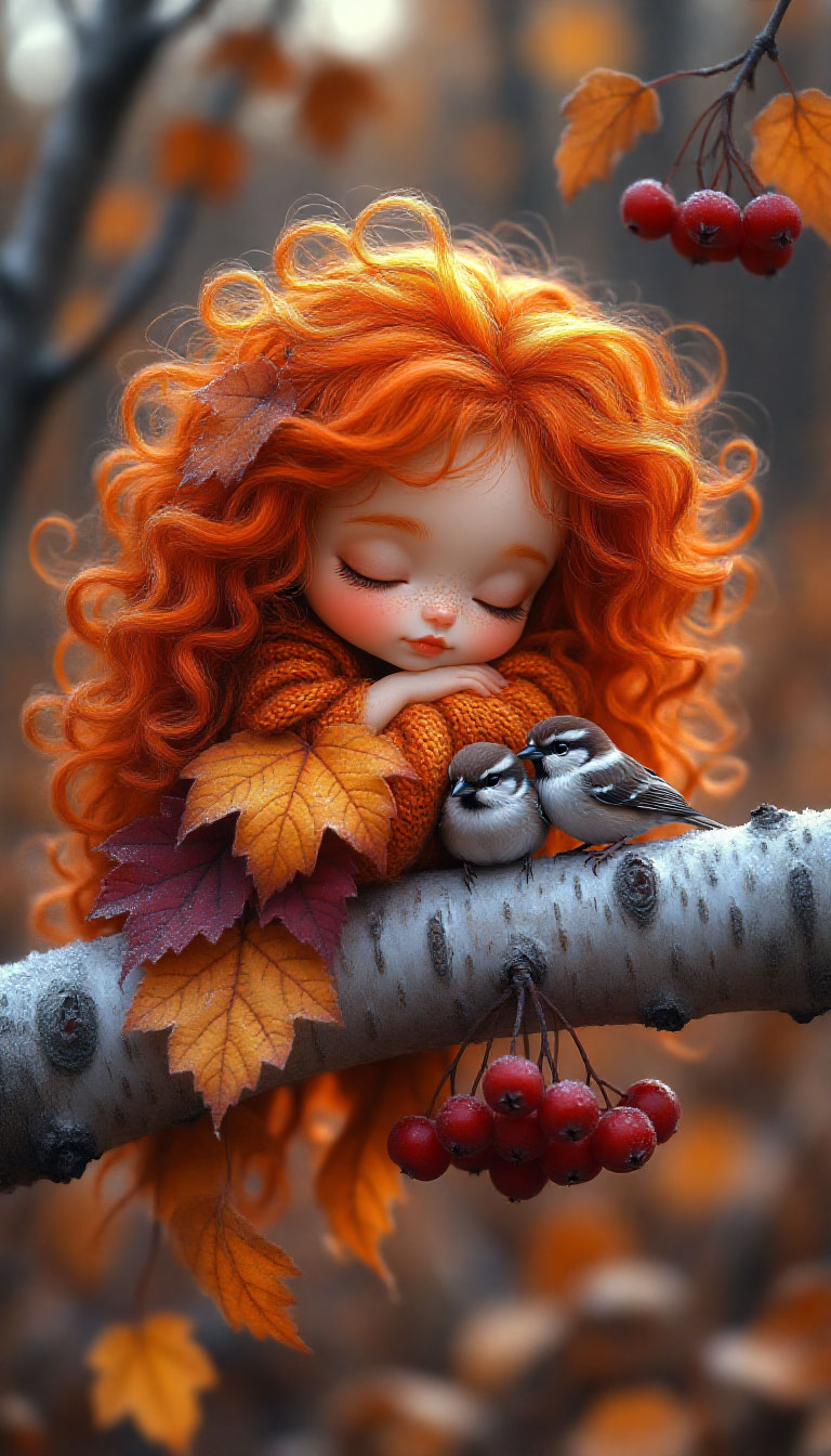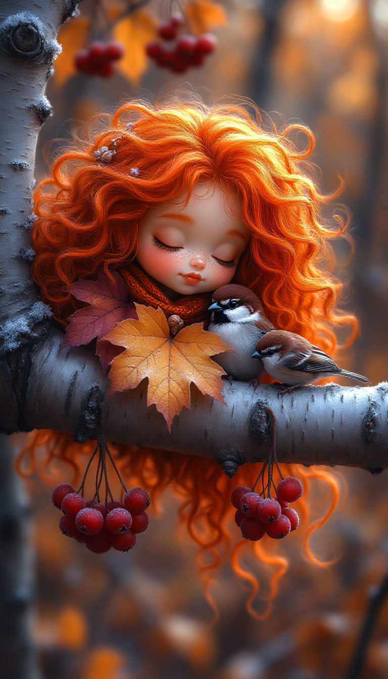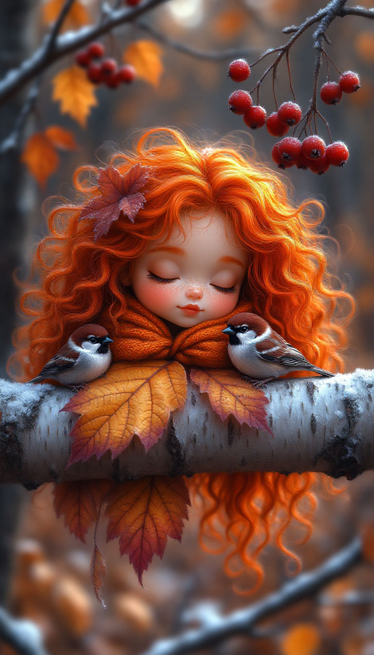 Маленькая фея с длинными вьющимися ярко-оранжевыми волосами, спящей на покрытой инеем березовой ветке.