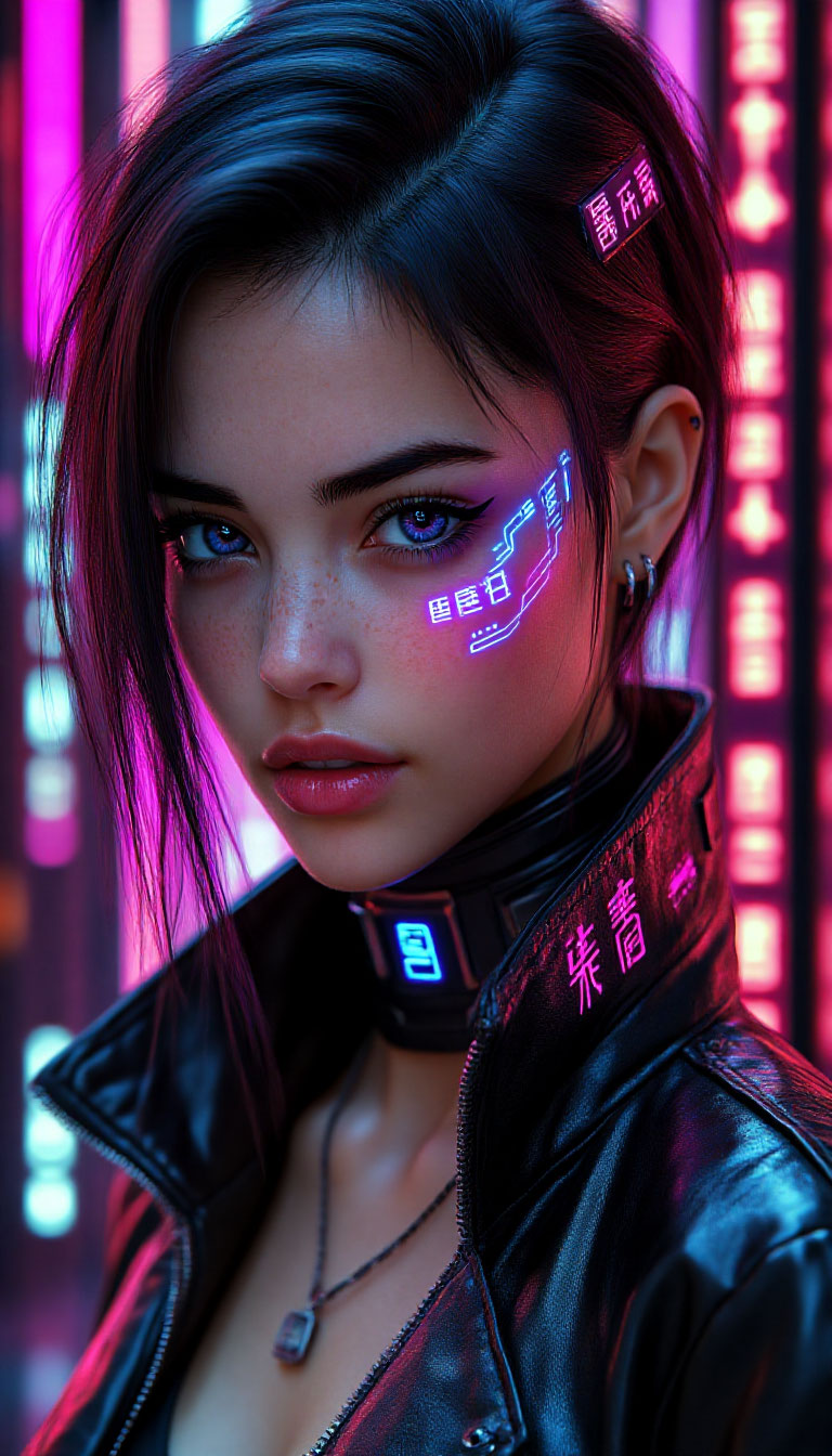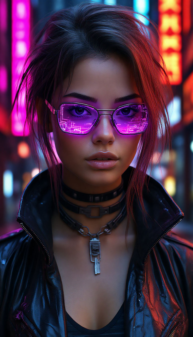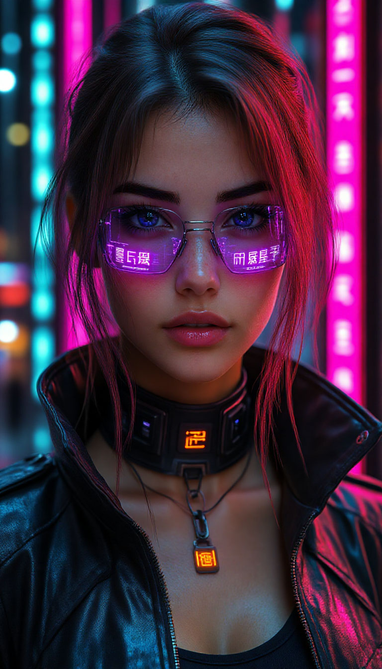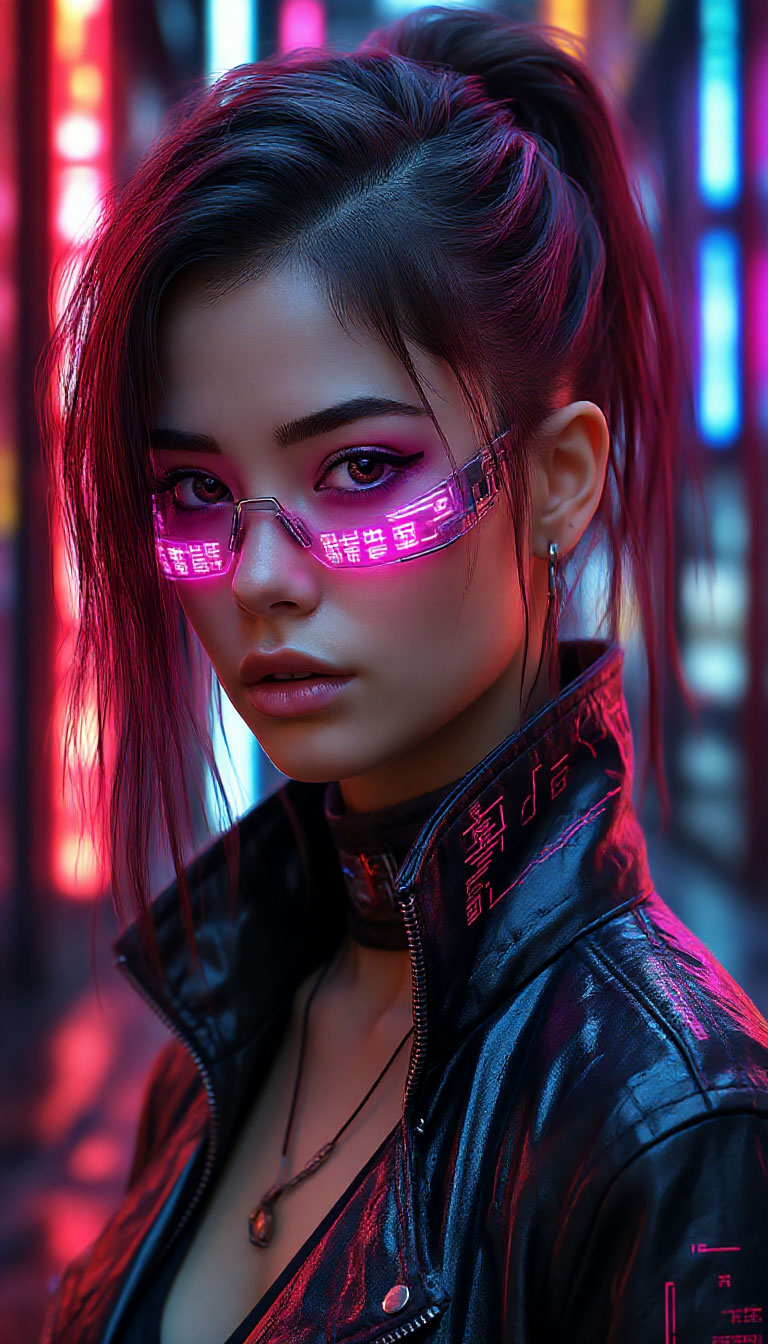 Фотореалистичны киберпанк-портрет с неоновым свечением и глитч-эффектами