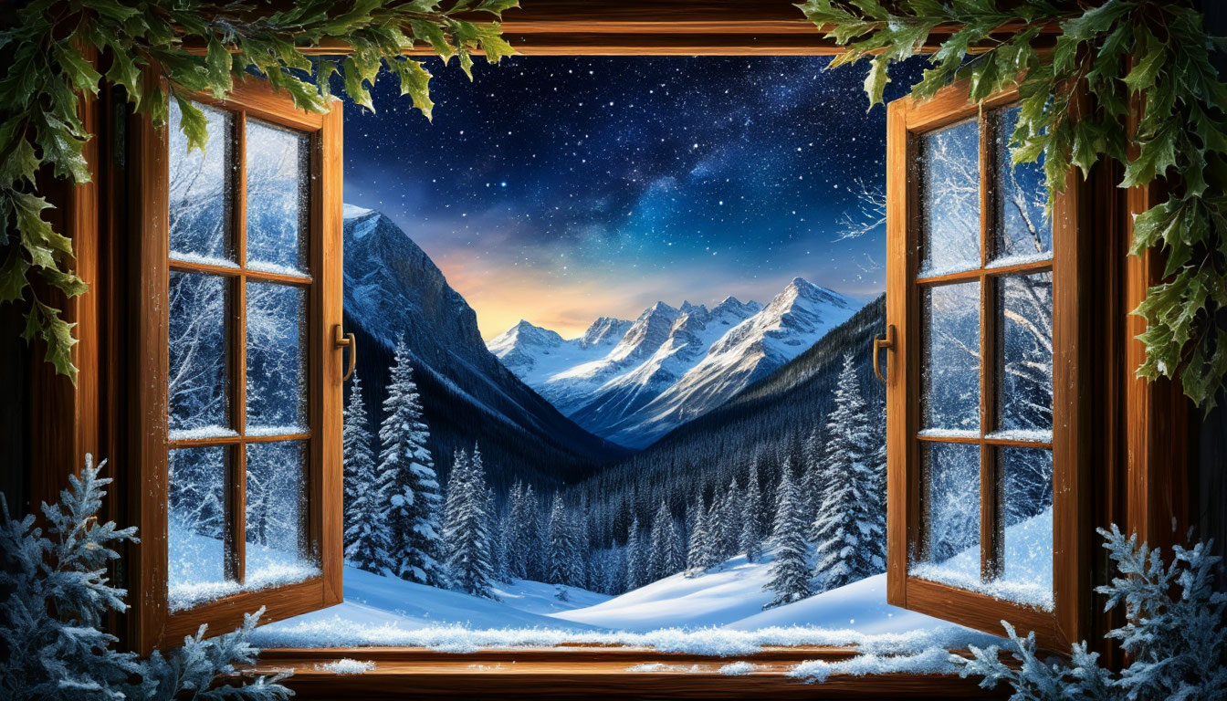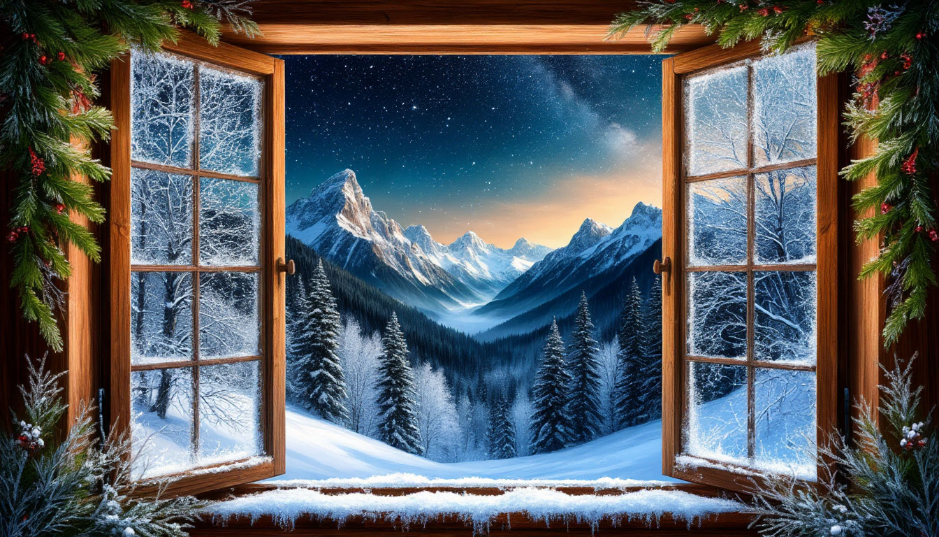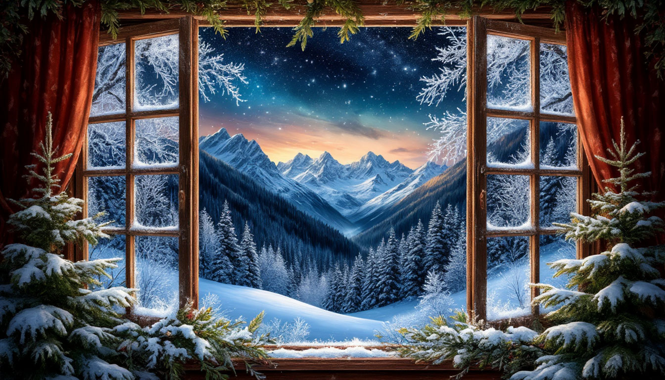 За окном виднеется зимний лес, горы и звездное небо. Сами окна покрыты инеем, а рамы покрыты листвой и елью.