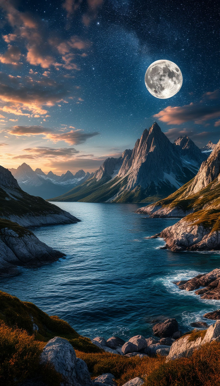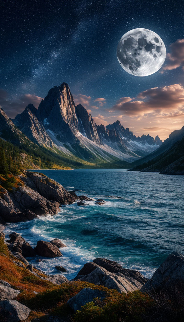 Здесь изображено, море, горы, луна и звездное небо, живописно и красиво.