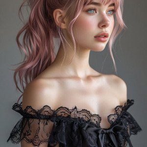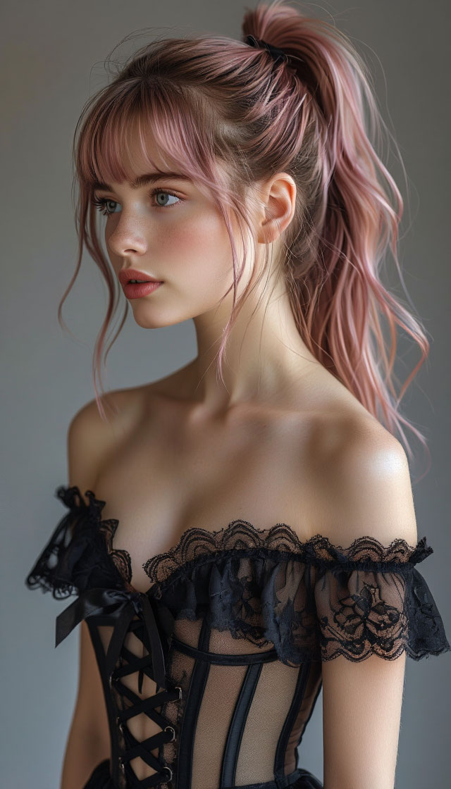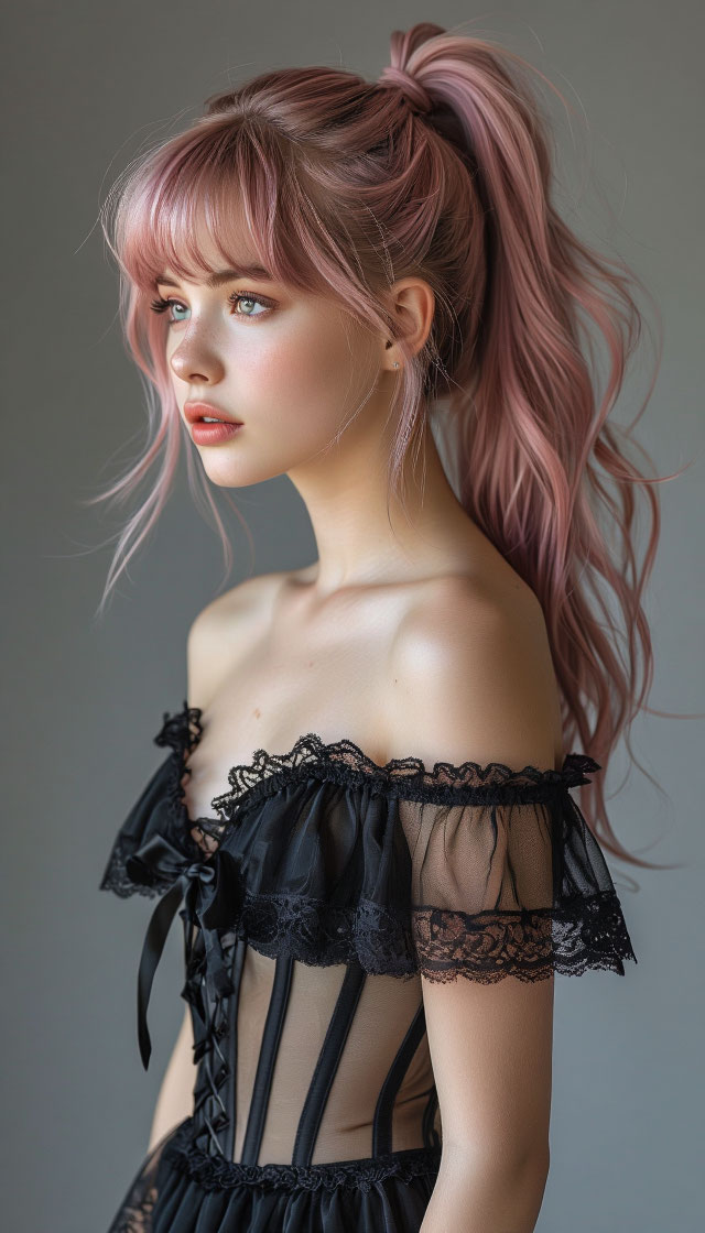 Реалистичный портрет молодой девушки с пепельно-розовыми волосами.