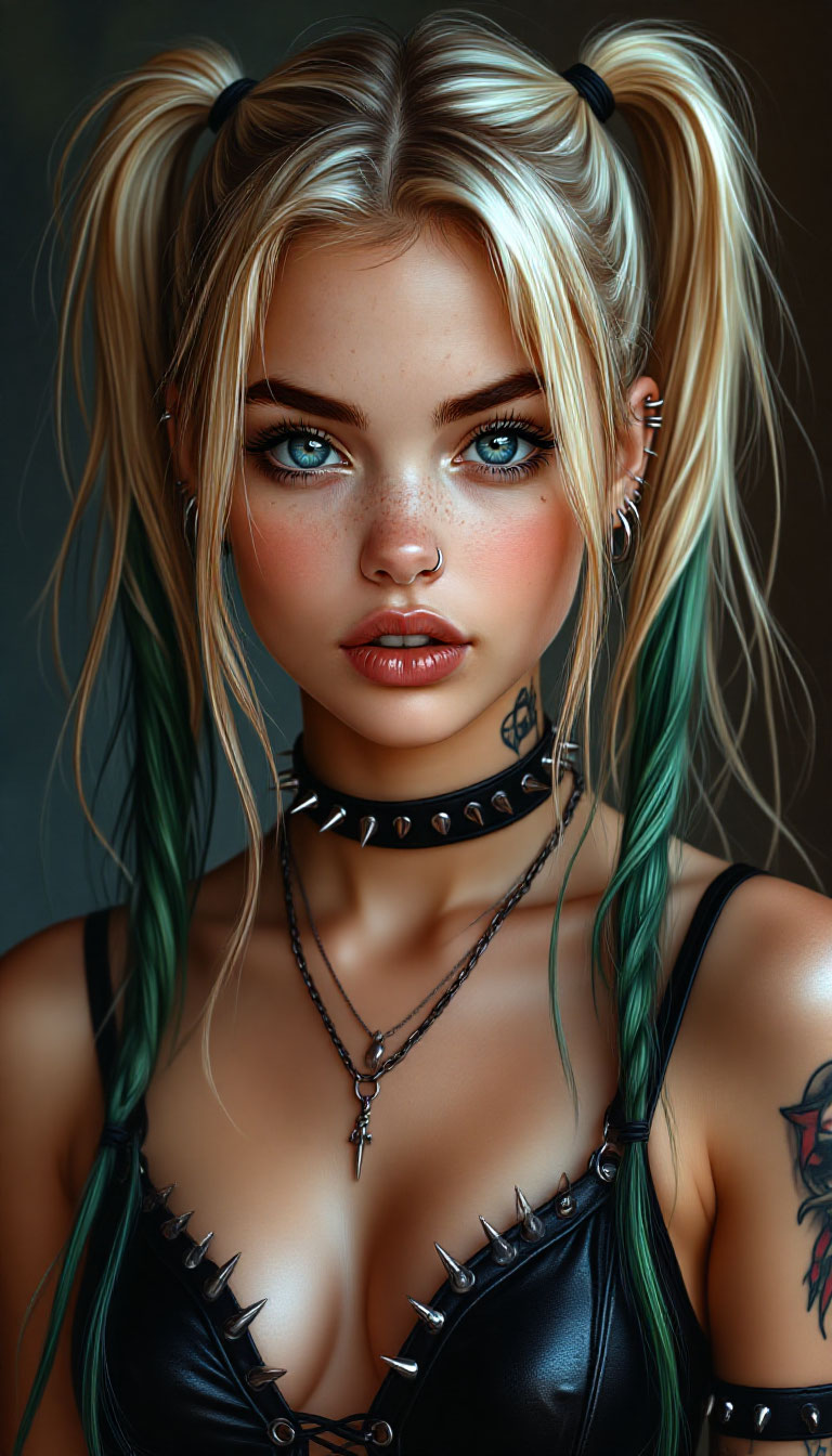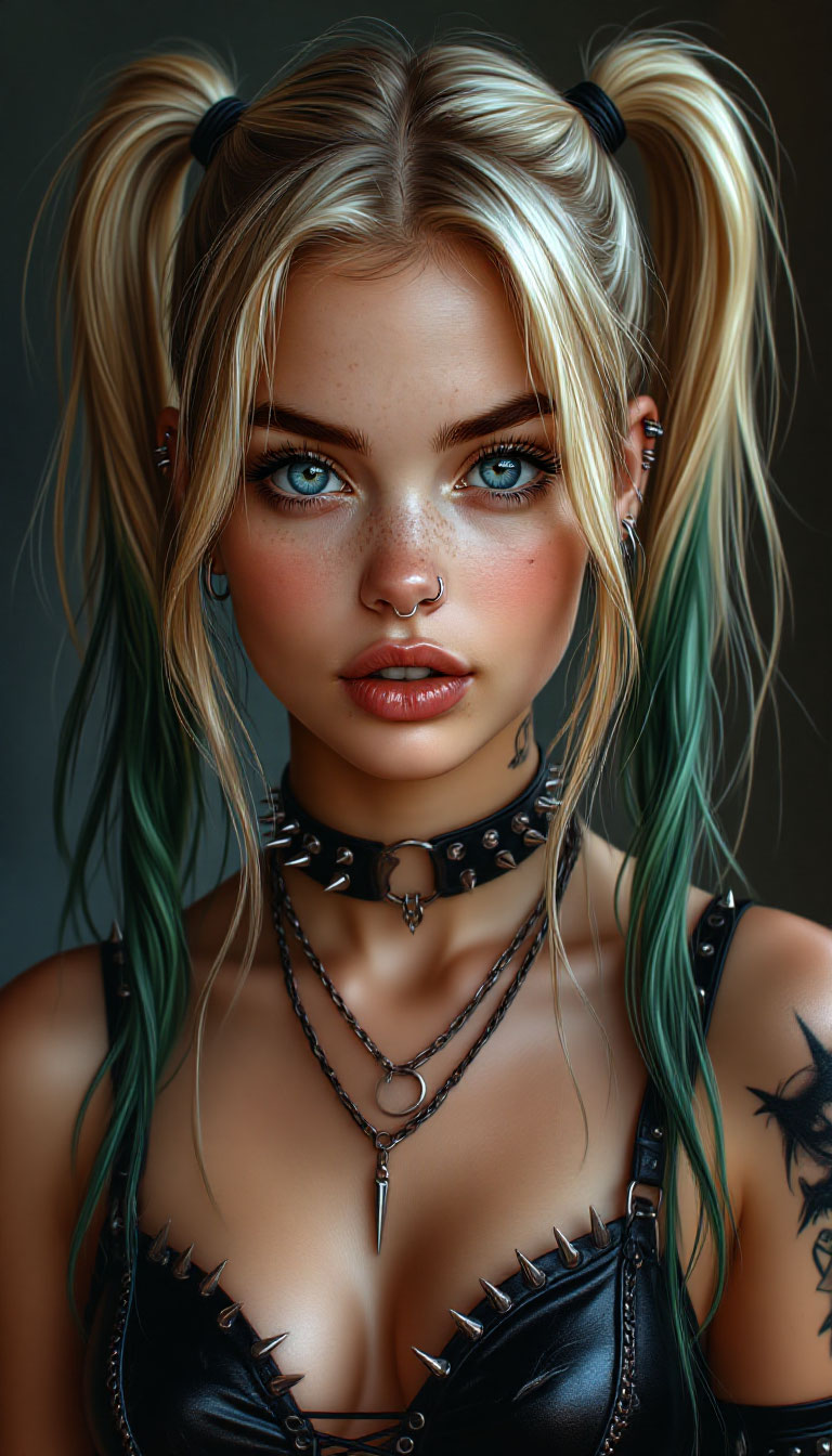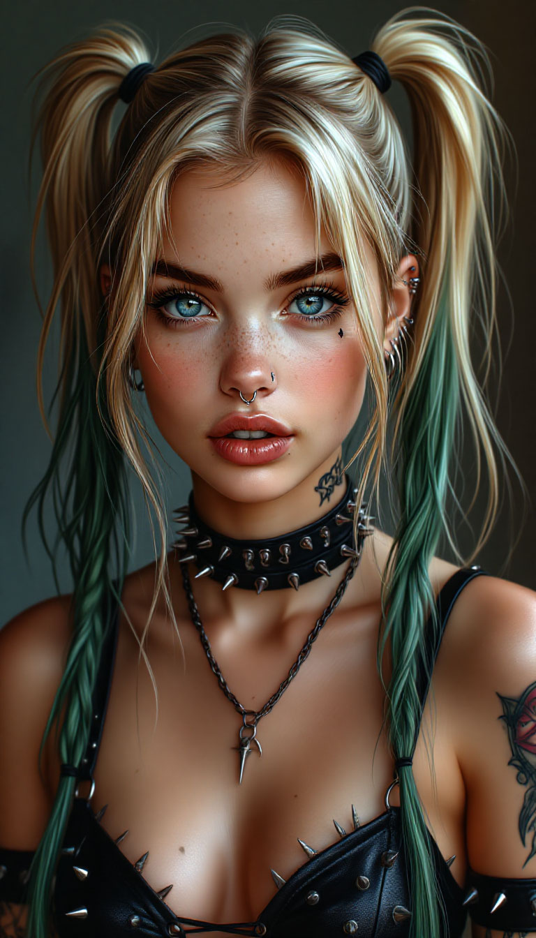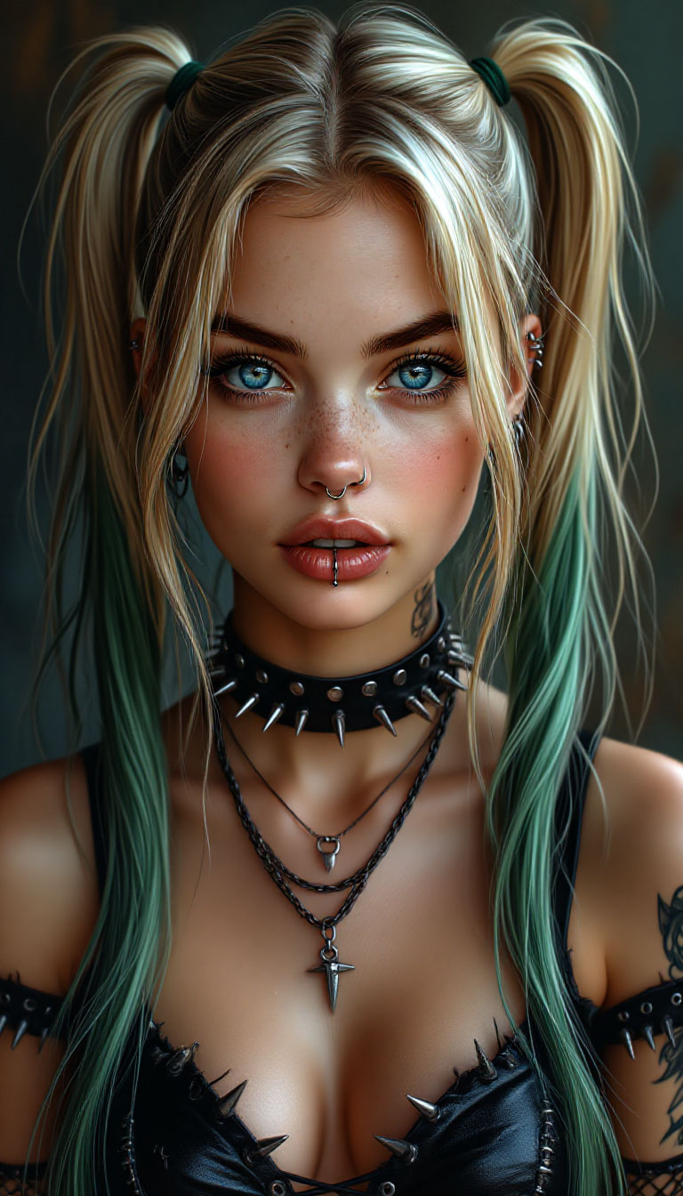 Портрет девушки со светлыми косами и тёмно-зелёными кончиками. Пиерсинг, чёрный кожаный ошейник с шипами.