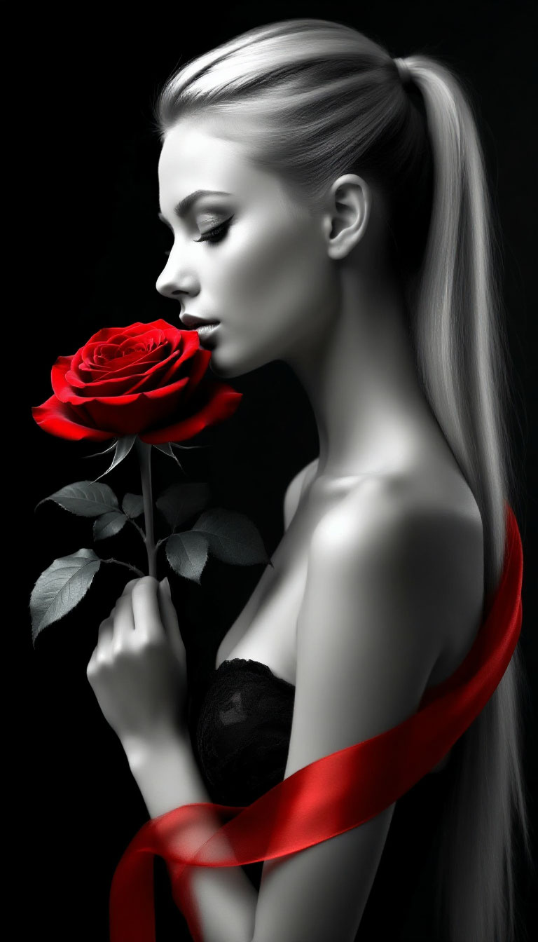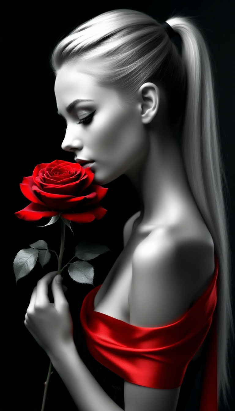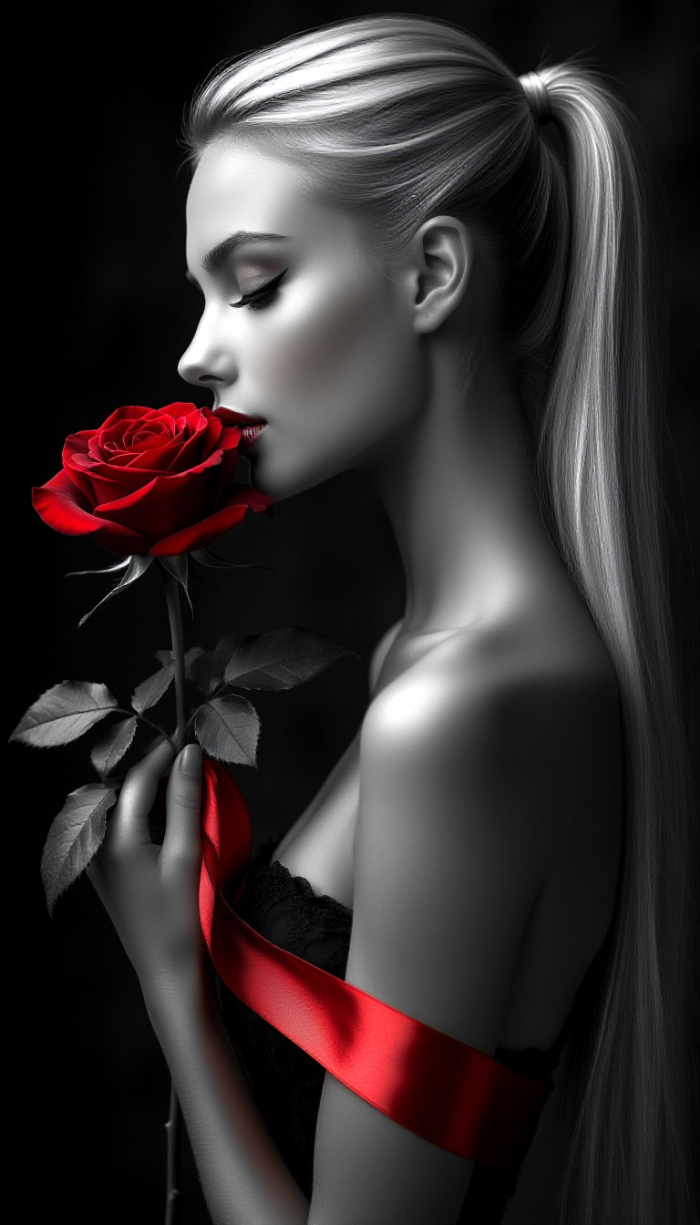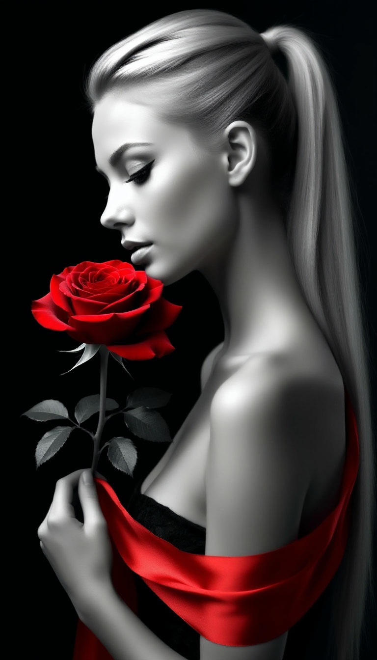 Чёрно-белый профиль женщины, прижимающей к лицу алую розу.
