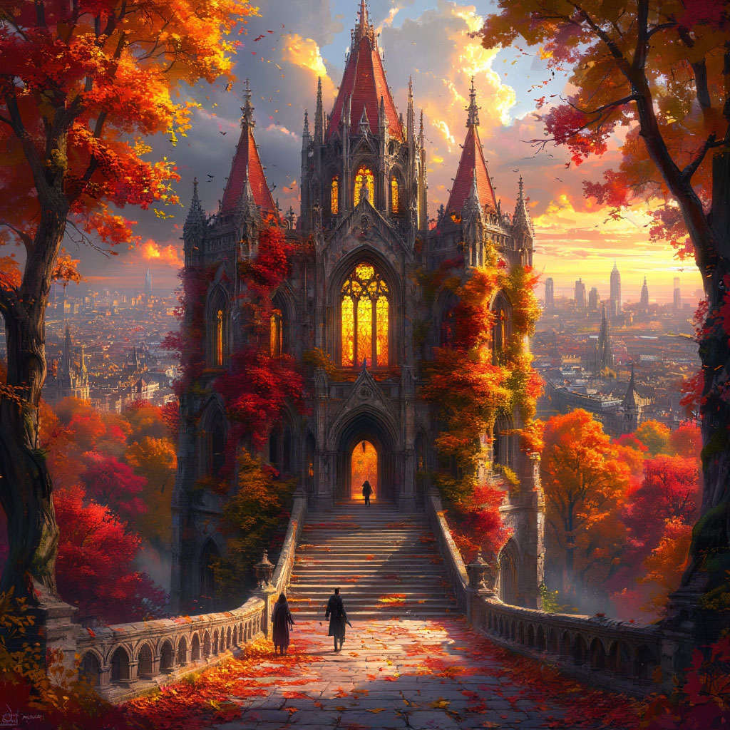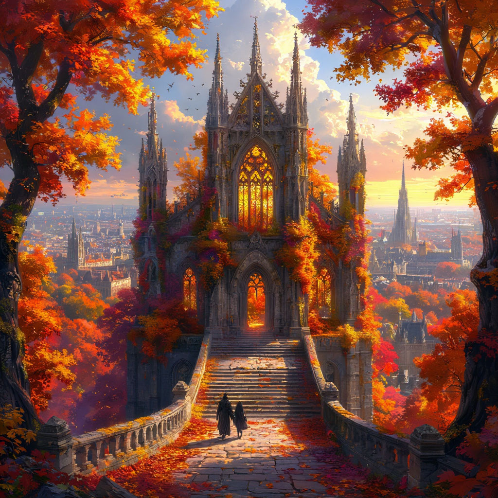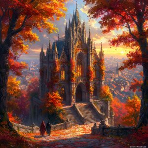 Готический собор погружен в пестрое покрывало из опавшей листвы. Две фигуры в темных плащах направляются к собору, вероятно, на службу. Они идут по каменной мостовой покрытой опавшими листьями. Рассеянный свет мягко скользит по городским крышам, касаясь время от времени самого собора. Это создает неповторимую атмосферу осеннего дня.