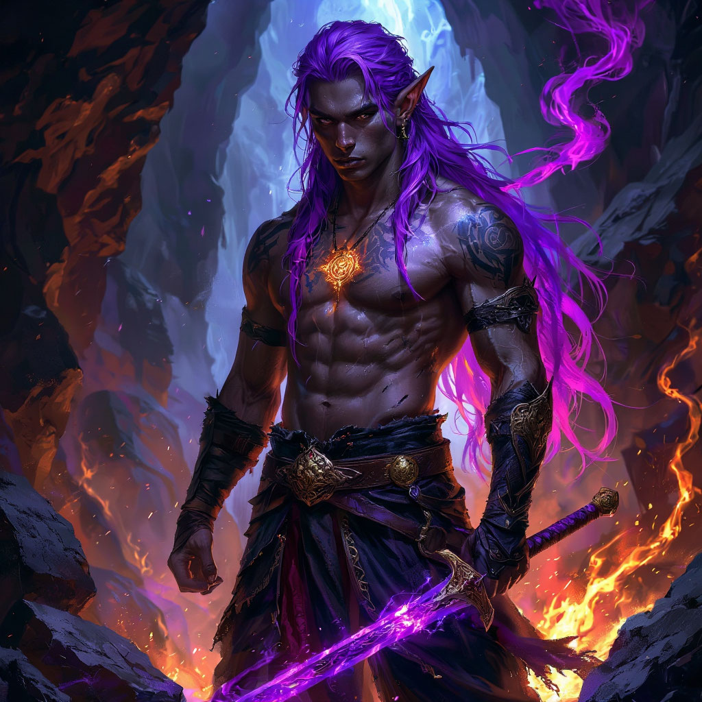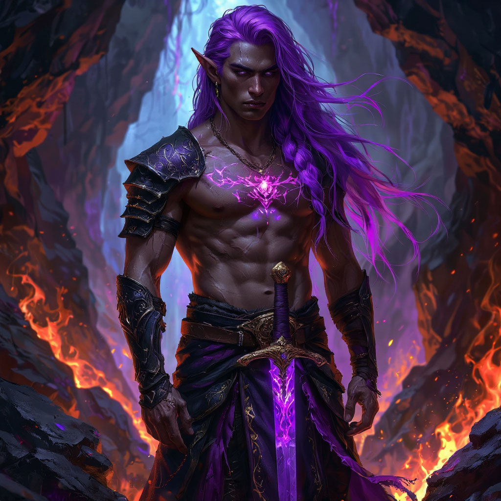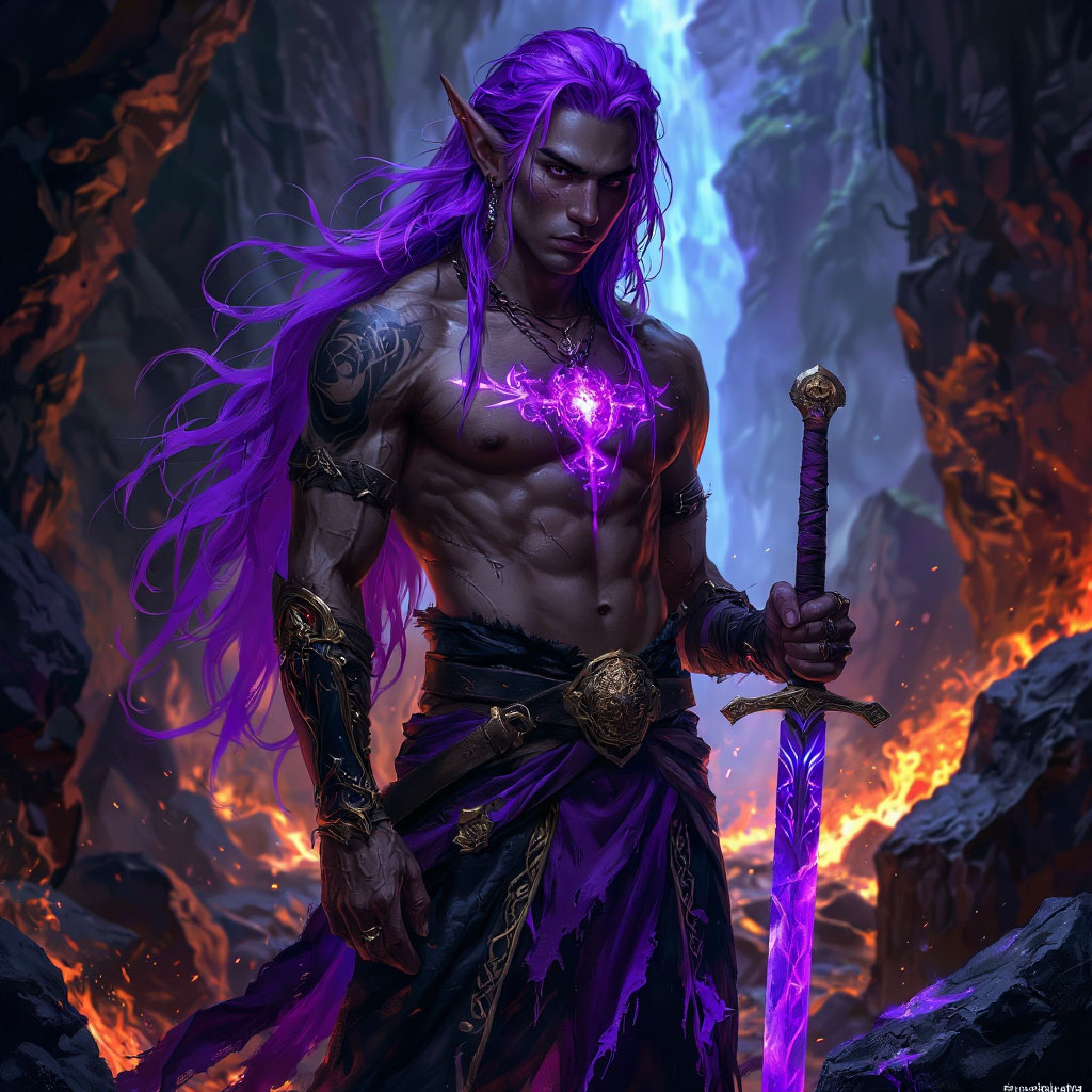 Темный эльфийский воин преграждает дорогу. Он словно страж, который не пропускает путников дальше. Он вооружен, как положено стражу. Его меч особенный. Фиолетовое свечение окутывает меч, словно он впитал частичку души своего владельца. Позади воина высокие скалистые утесы, освещенные огненным сиянием. Но что там дальше?