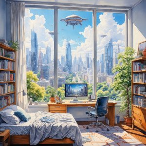 Солнечные лучи пробиваются сквозь занавески ранним утром, заливая комнату светом и открывая чудесный вид на город. Вероятно, хозяин уже покинул своё уютное убежище. Куда он пошёл? Может в библиотеку? Обилие книг на полках говорит о его любви к чтению.