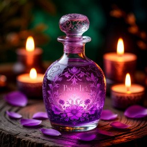 На столе стоит расписной стеклянный флакон, наполненный зельем. Его изящная гравировка и легкое волшебное свечение свидетельствуют о необычности и высокой стоимости этого эликсира. Такое зелье доступно далеко не каждому. Вокруг флакона разбросаны лепестки цветов, а свет от свечей, проходя через зелье, усиливает его свечение, подчеркивая атмосферу волшебства и чуда.