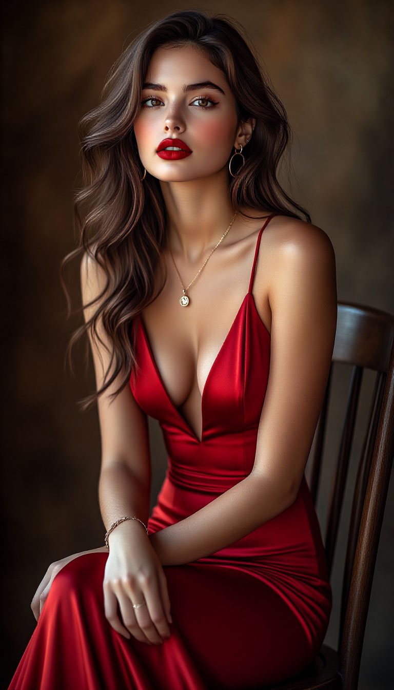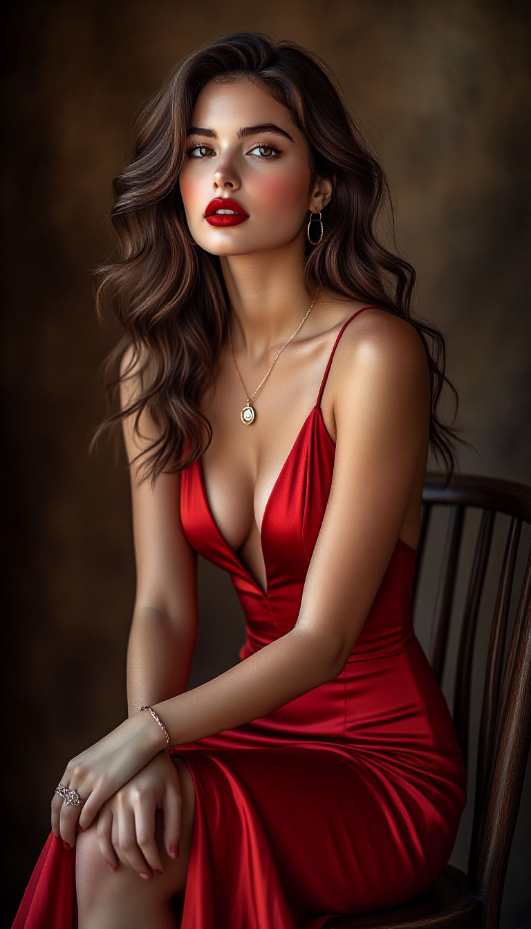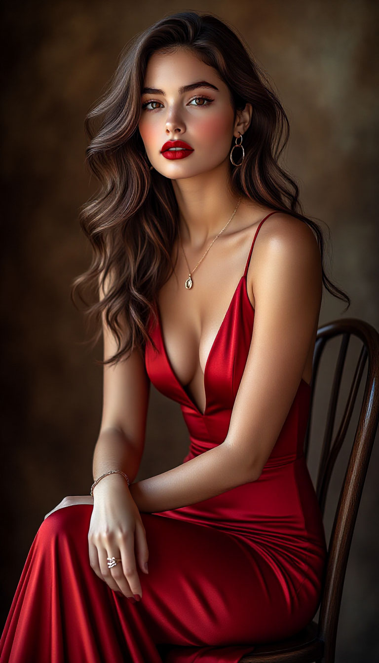 Гламурный фэшн-портрет женщины в красном платье на теплом коричневом фоне.