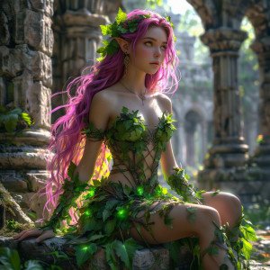 Лесная нимфа, грациозно расположилась среди древних руин города. Ее платье, усыпанное листьями, мягко облегало фигуру, подчеркивая изящество и очарование юной красавицы.