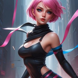 Девушка-воин в динамичной позе с короткими розовыми волосами и ярко-голубыми глазами.