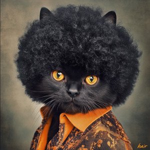 Юмористический портрет черного кота с афро-прической в стиле ретро 70-х.