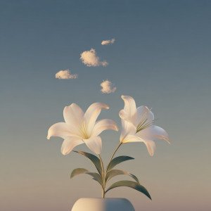 Белая керамическая ваза с лилией на градиентном фоне от нежно-небесного к тёмно-синему. Верхние лепестки лилии плавно переходят в маленькие облака.