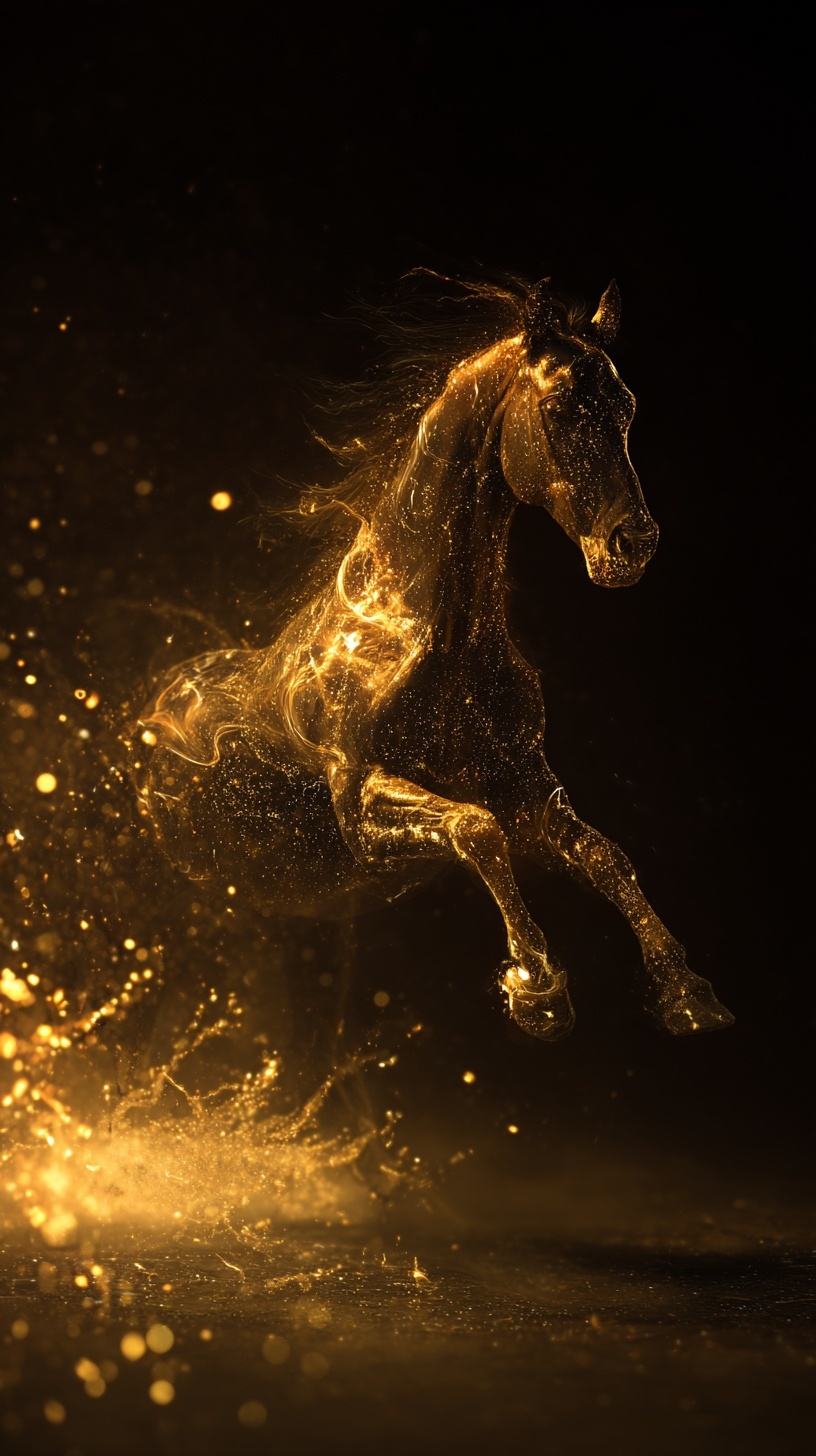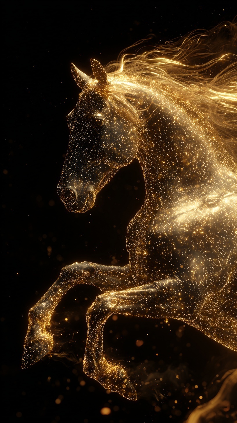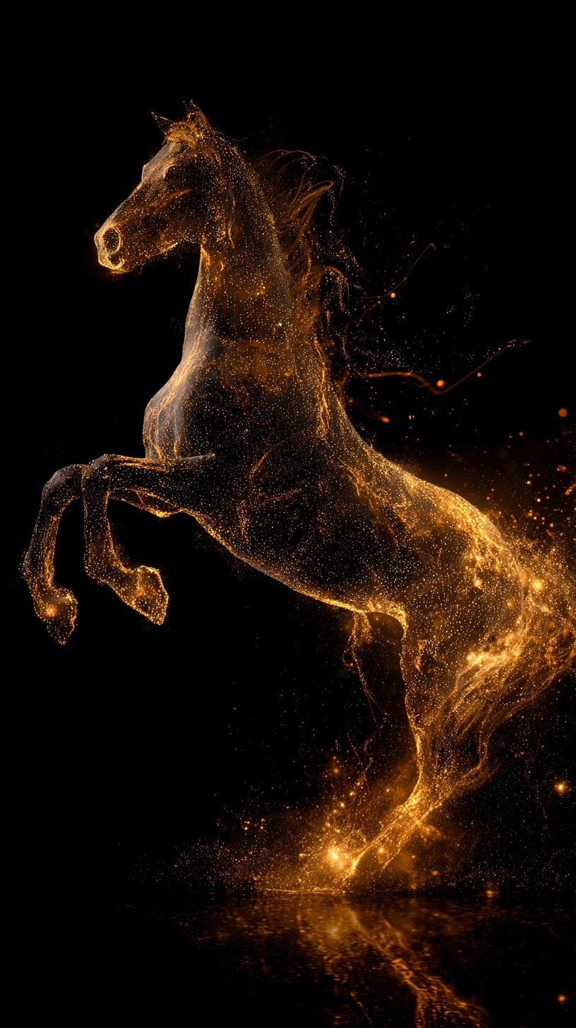 Конь из светящихся золотых частиц в прыжке на чёрном фоне.