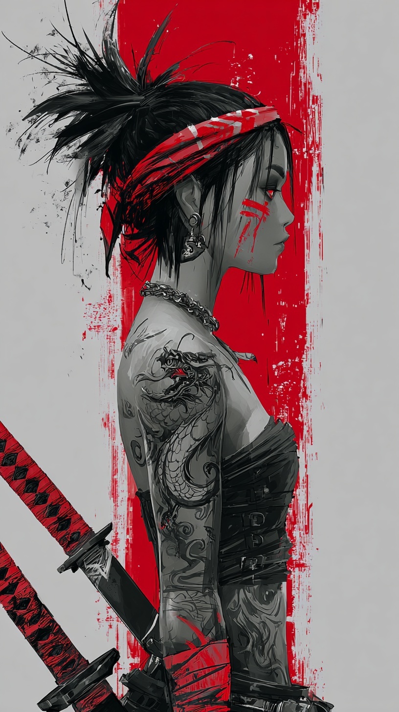 Татуировка дракона на плече, чёрный корсет, катана за спиной.