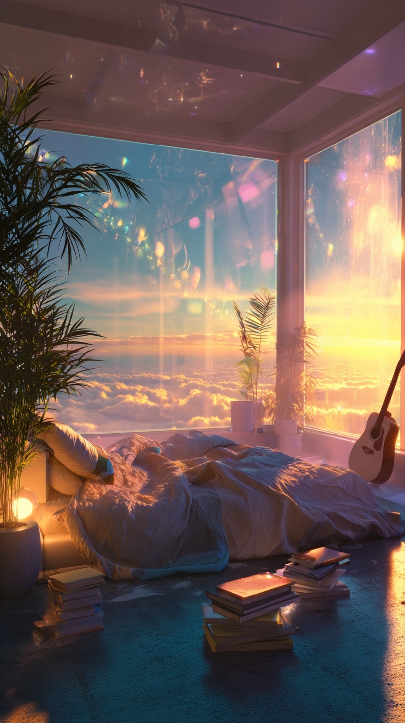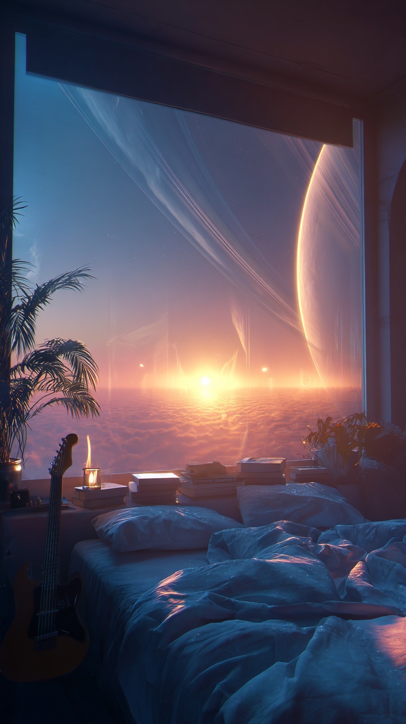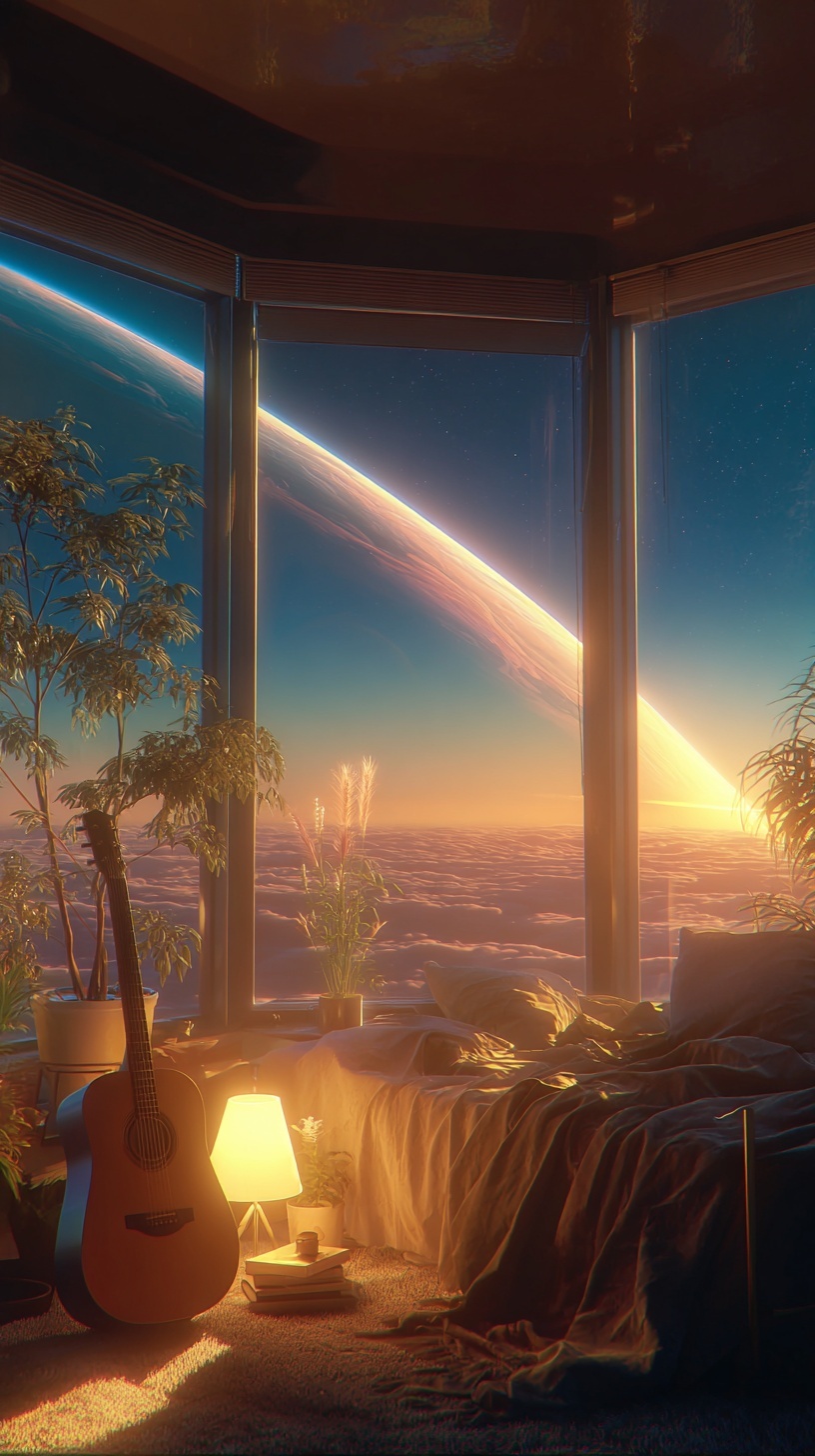 Уютная футуристическая спальня на закате: тёплый свет лампы и холодные синие тени, мягкие одеяла, книги, гитара в углу.
