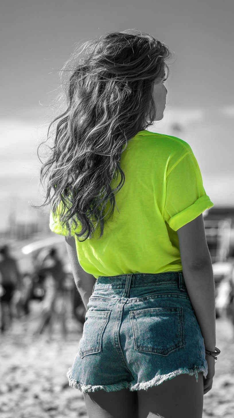 Фотография с выборочной окраской, вид сзади на девушку. Её кожа, волосы и размытый пляжный фон — в чёрно-белой гамме, а яркая неоновая футболка и джинсовые шорты остаются цветными.
