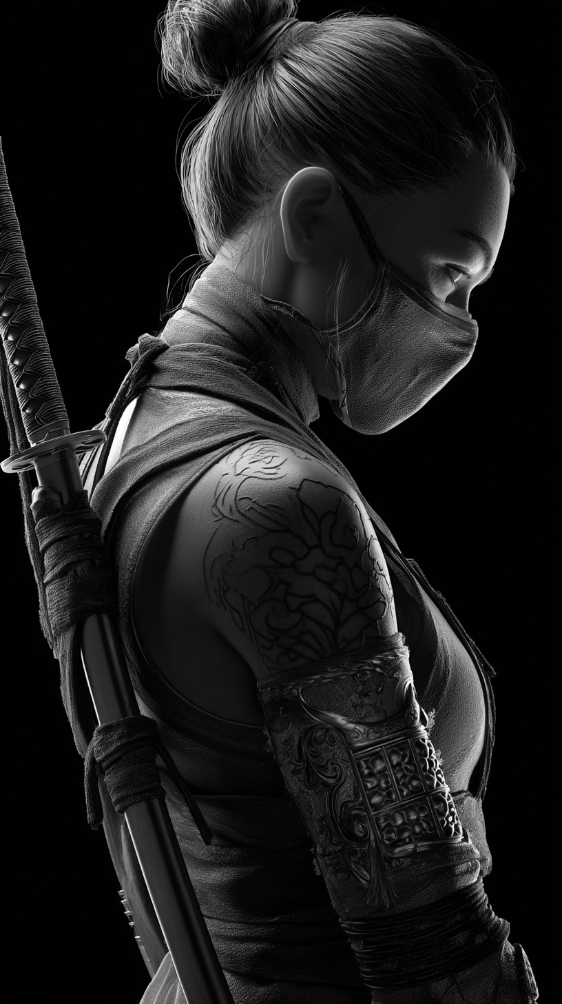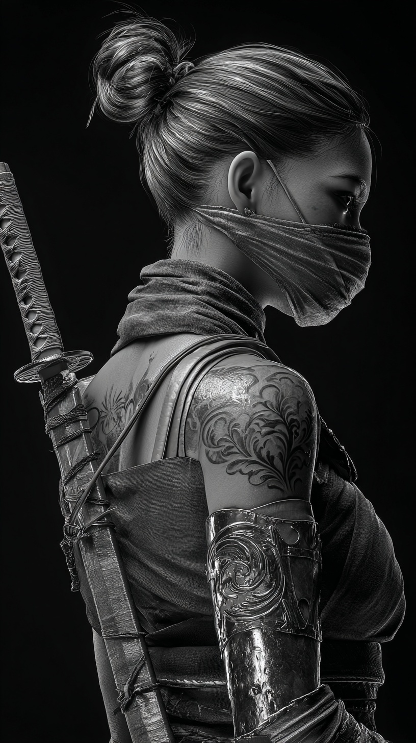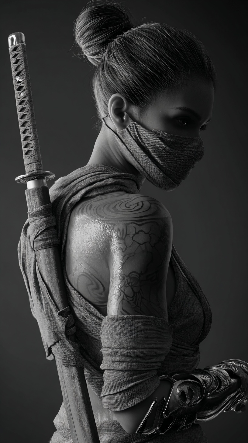 Женщина-ниндзя - за спиной катана, металлическая перчатка, татуировка на плече.