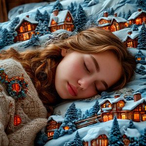 A [sleeping_girl] ([close-up]) on [unusual_bed_linen] with a [volumetric_winter_landscape] design. The [fabric] shows a [snow-covered_village] with [wooden_houses] glowing with [warm_light_from_windows] and [fir_trees_covered_with_snow]. The [girl] seems to be sleeping right inside this [fairy-tale_winter_village]. The [warm_lighting] and [soft_shadows] create a [cozy_peaceful_atmosphere], perfectly matching her [serene_expression].